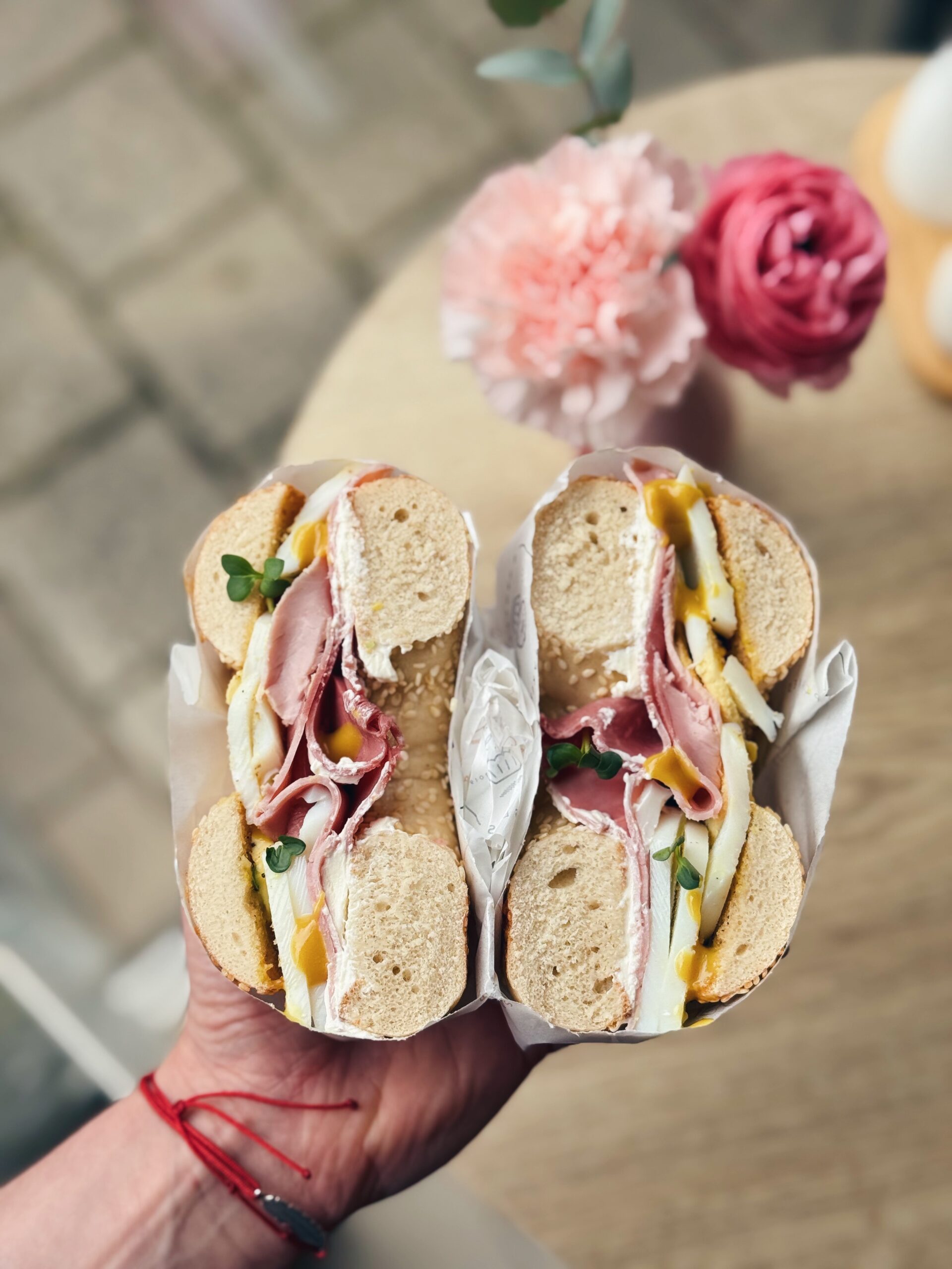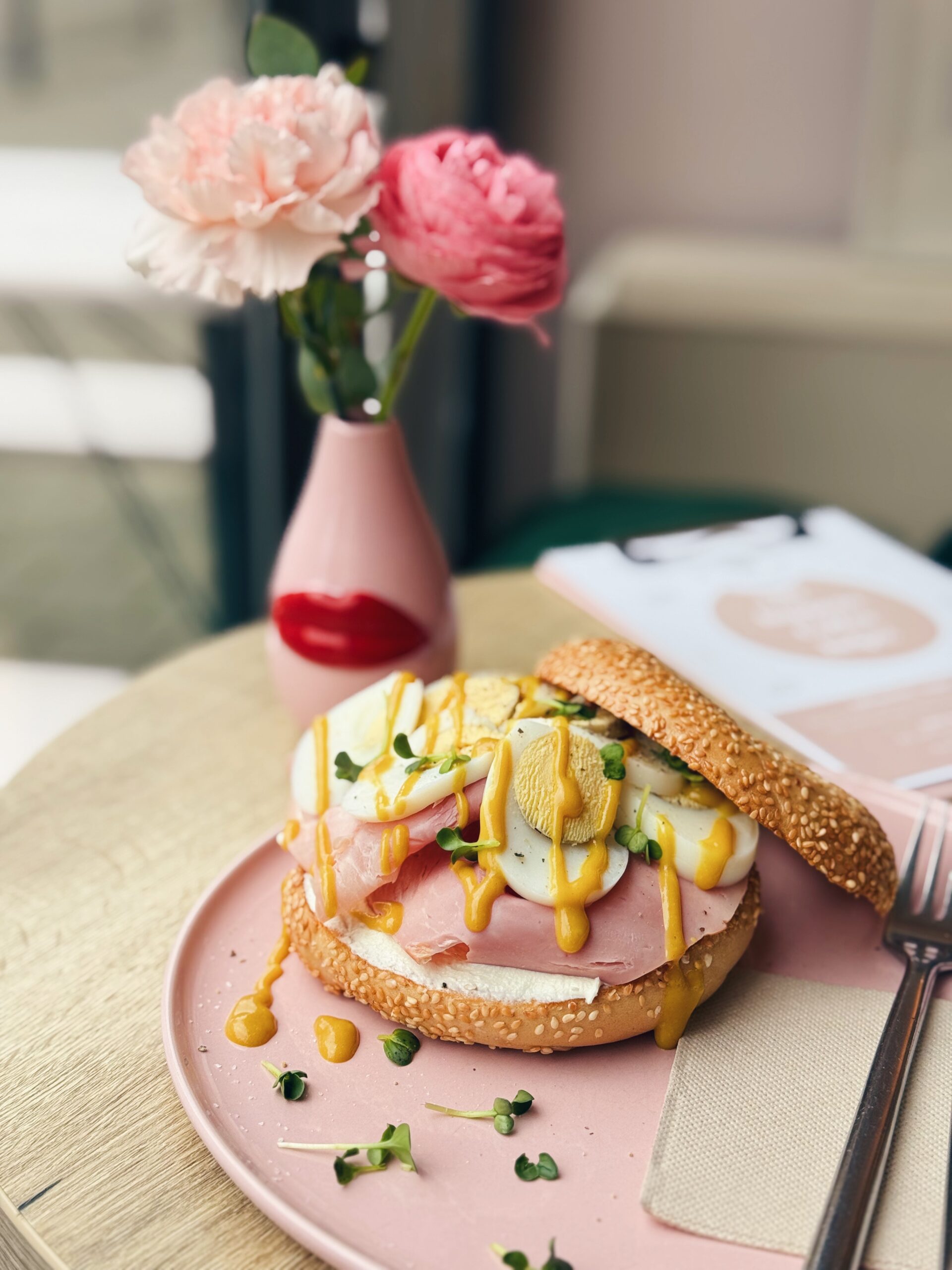 Frischkäse, Kochschinken (Schwein), gekochtes Ei, Senfsoße