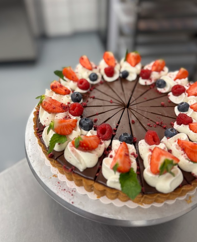 Wir freuen uns euch ein neues Produkt vorzustellen – unsere leckeren Schokoladen Tartes. Der knusprige Gebäckboden bildet die perfekte Basis für diese Tarte. Er ist hauchdünn und leicht buttrig, um den perfekten Kontrast zur cremigen Schokoladen Füllung zu bieten. Jeder Bissen fühlt sich an wie ein Tanz auf der Zunge, bei dem die unterschiedlichen Texturen und Aromen miteinander verschmelzen. Dekoriert wird er mit Saisonellen Früchten.